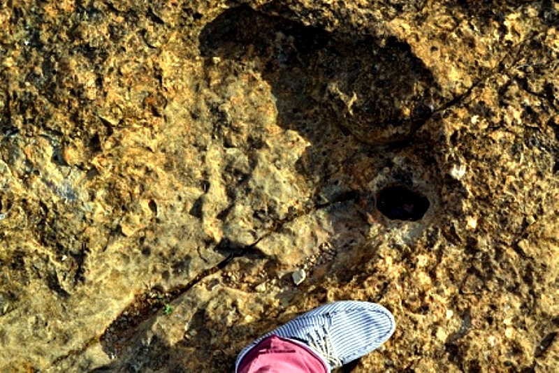 Итак, вот они, следы динозавра. Их не так уж много. Но видно довольно отчетливо. Точный возраст не известен. Где-то 150-170 миллионов лет.