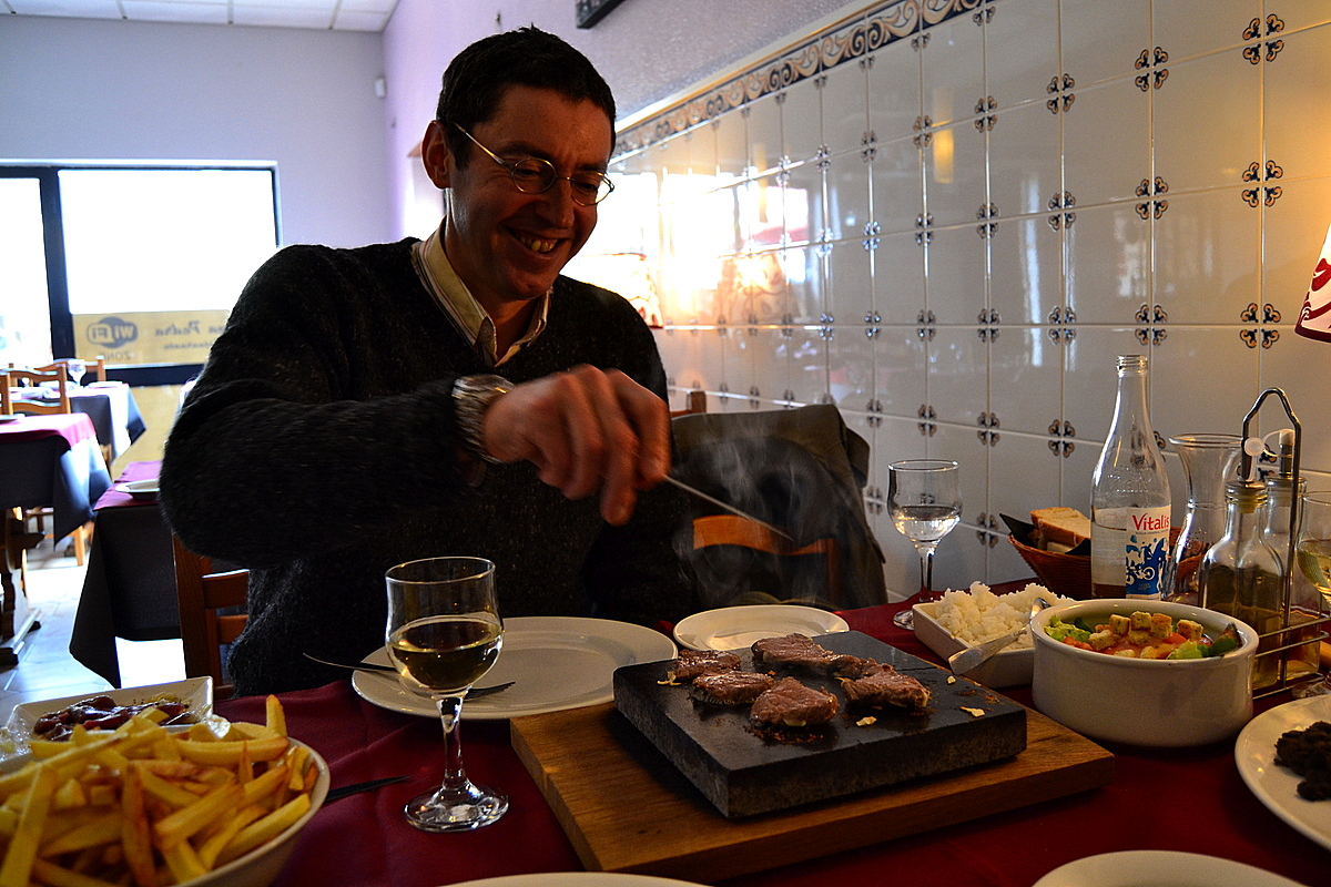 Выбор был не из легких. Официантка, она же супруга владельца, изо всех сил старалась нам помочь, подливая портвейна и рассказывая о мясе, способах его приготовления и заодно, об истории ресторана. К ней присоединился сеньор Антонио. Он пожелал узнать, откуда мы. Услышав, что мы из России, сеньор радостно сообщил нам, что посещал нашу страну 30 лет назад, во времена правления Черненко. Правда помнит он только одно русское слово. Я думала, что это будет “хорошо”, или “спасибо”, но нет, мы услышали “подушка”.... Затем мы стали вместе вспоминать наших правителей. Все наши португальские друзья оказались большими поклонниками Горбачева. Так, за разговором о политиках, мы все-таки сделали наш выбор. Хотя и оказались не оригинальны, заказав мясо, приготовленное на камне.