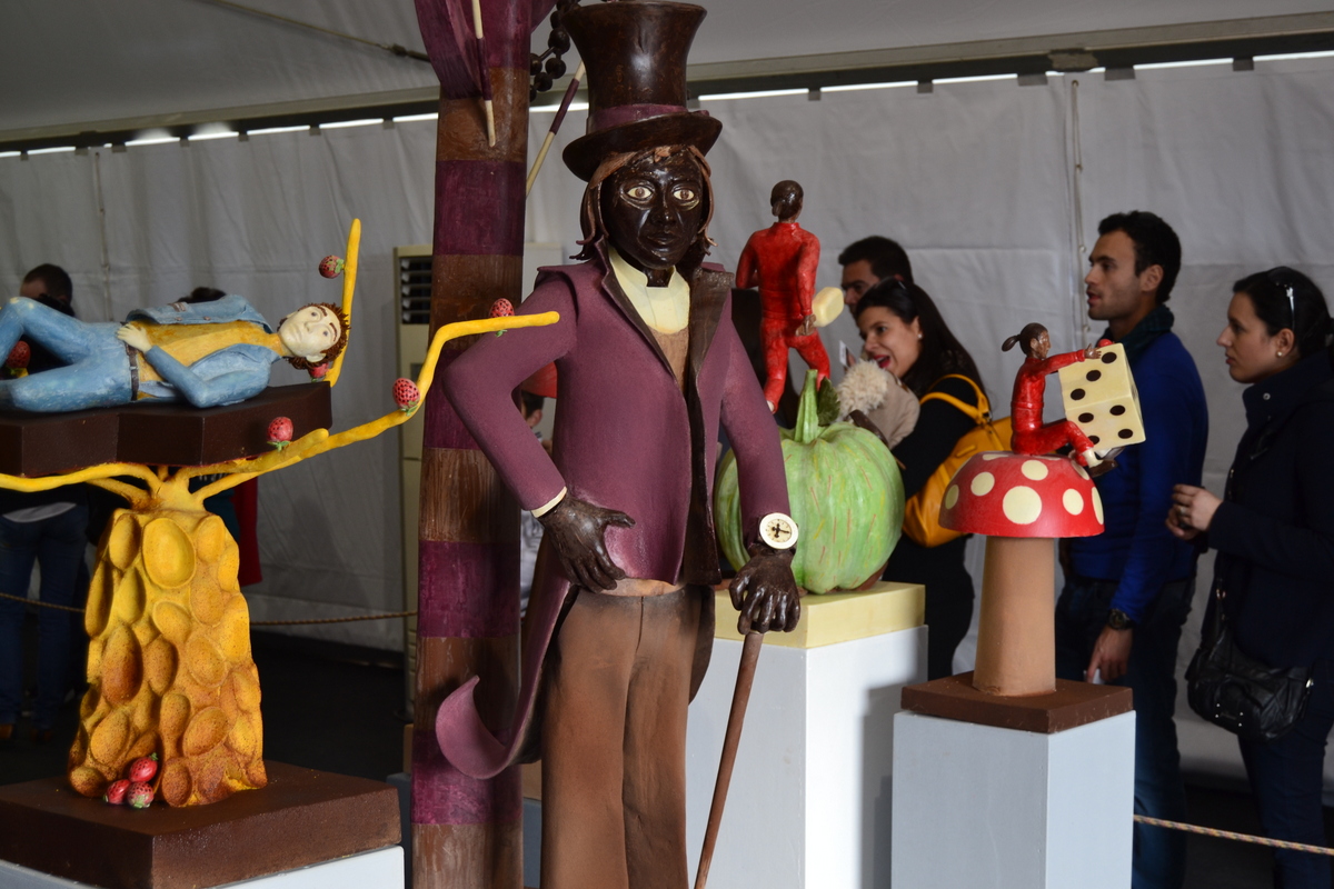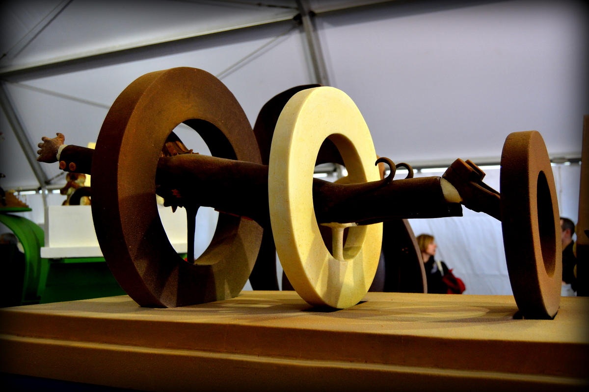 Но прежде, чем начать все это пробовать, стоит нагулять аппетит. Сделать это совсем несложно. Сначала нужно, следуя указателям (или ароматам), подняться по узким средневековым улочкам на самый верх, потом спуститься вниз и постоять в очереди в главный шатер. Здесь, в шатре находятся конкурсные работы. Все они сделаны вручную, и исключительно из шоколада. В этом году в конкурсе приняли участие шесть кондитерских домов. А тема конкурса - “Чарли и шоколадная фабрика”. Поскольку тема немного “индустриальная”, то и композиции, в основном, посвящены фабрикам, станкам, машинам…. Что же, немного неожиданно, но почему бы и нет.