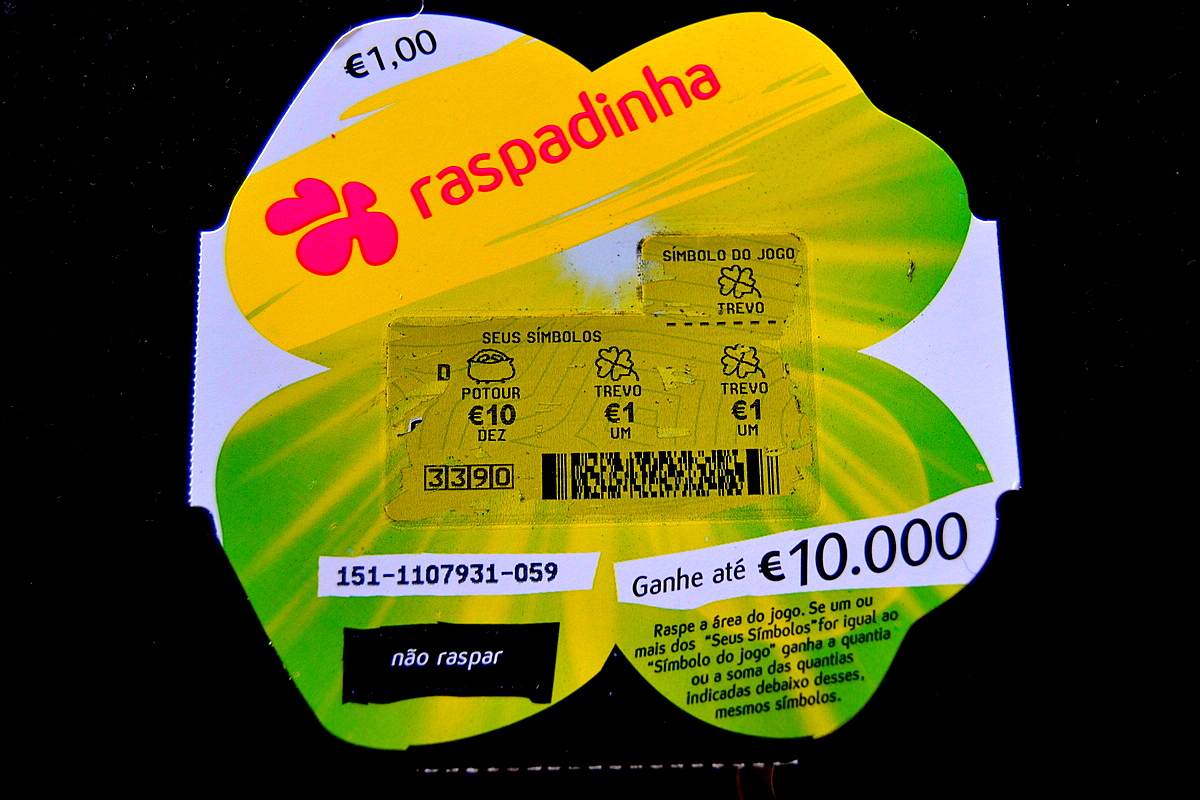 Мама моей подруги, например, предпочитает моментальную лотерею. За всю свою жизнь, она выиграла, может быть 10-20 евро, но все равно раз в неделю она покупает несколько билетов Рашпадинья. Raspadinha – так называется моментальная лотерея в Португалии. Я читала в какой-то газете, что за прошлый год, доходы от Raspadinha в Португалии, составили 337 миллионов евро. В этой же газете было сказано, что моментальная лотерея становится все популярнее. В принципе, ничего удивительного в этом нет. Стоит Raspadinha 1 евро за билет, максимальный выигрыш – 10 000 евро. До 150 выигранных евро можно получить сразу же, не отходя от кассы, как говорится. Существует много разновидностей Raspadinha. Например, очень популярна Raspadinha pé-de-meia стоимостью 3-5 евро. В ней сумма выигрыша выше, а вот получить его можно только в виде ежемесячной премии - 2000 евро в течение 12 лет. Согласитесь, неплохая прибавка к пенсии, если выиграть, конечно. Возможно, поэтому португальские пенсионеры так самозабвенно стирают монеткой защитный слой с билетов Raspadinha.