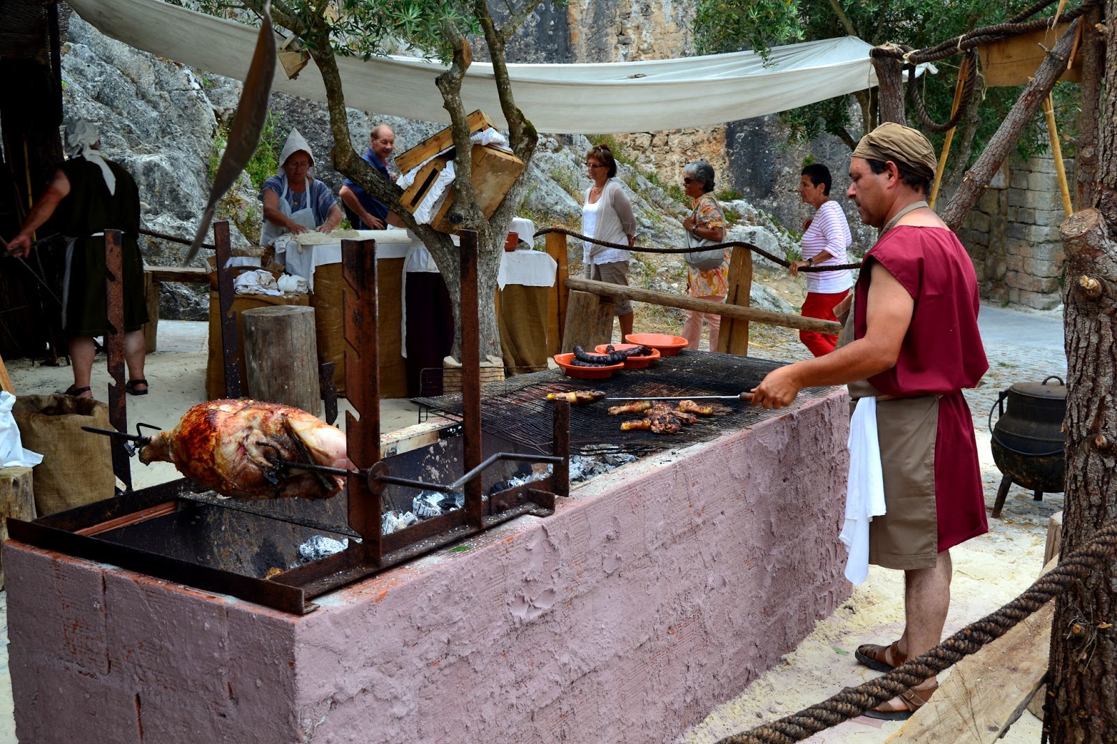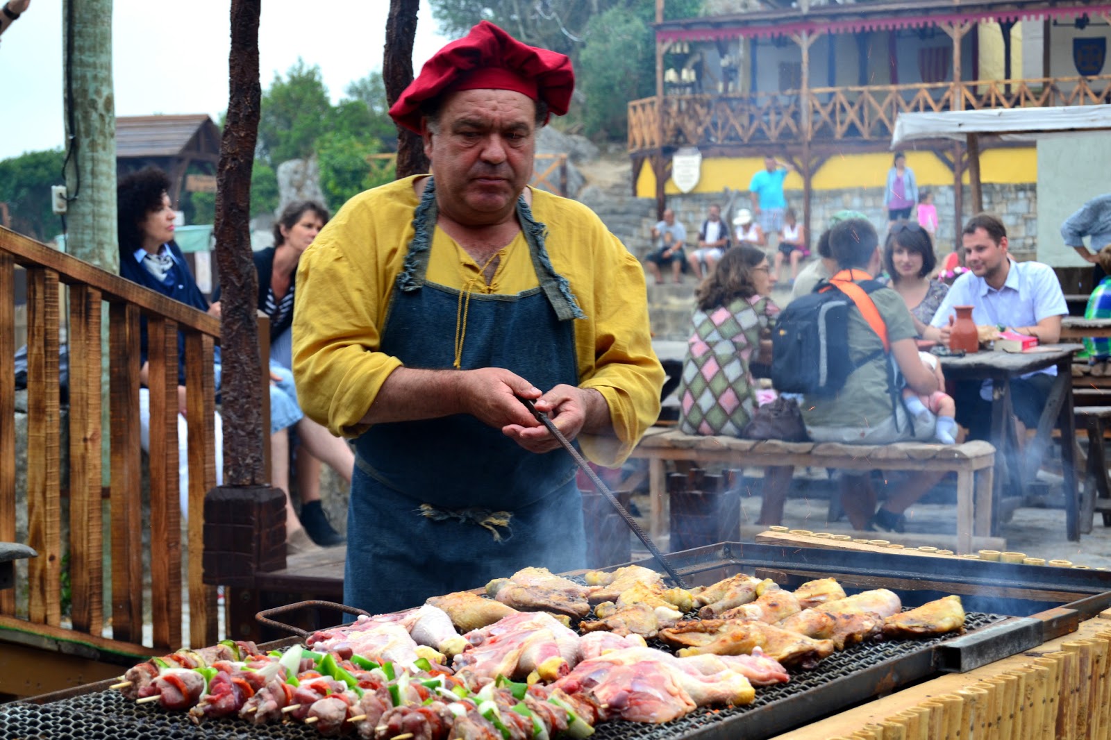 Аромат кушаний, готовящихся на открытом огне, заставит почувствовать голод кого угодно. Мы, например, перекусили перед посещением ярмарки. Но, как только поднялись к замку, то поняли, что опять хотим есть. И немудрено. Таверны – повсюду. Абсолютно все готовится на огне. Сосиски, колбасы, шашлыки, целые поросята….