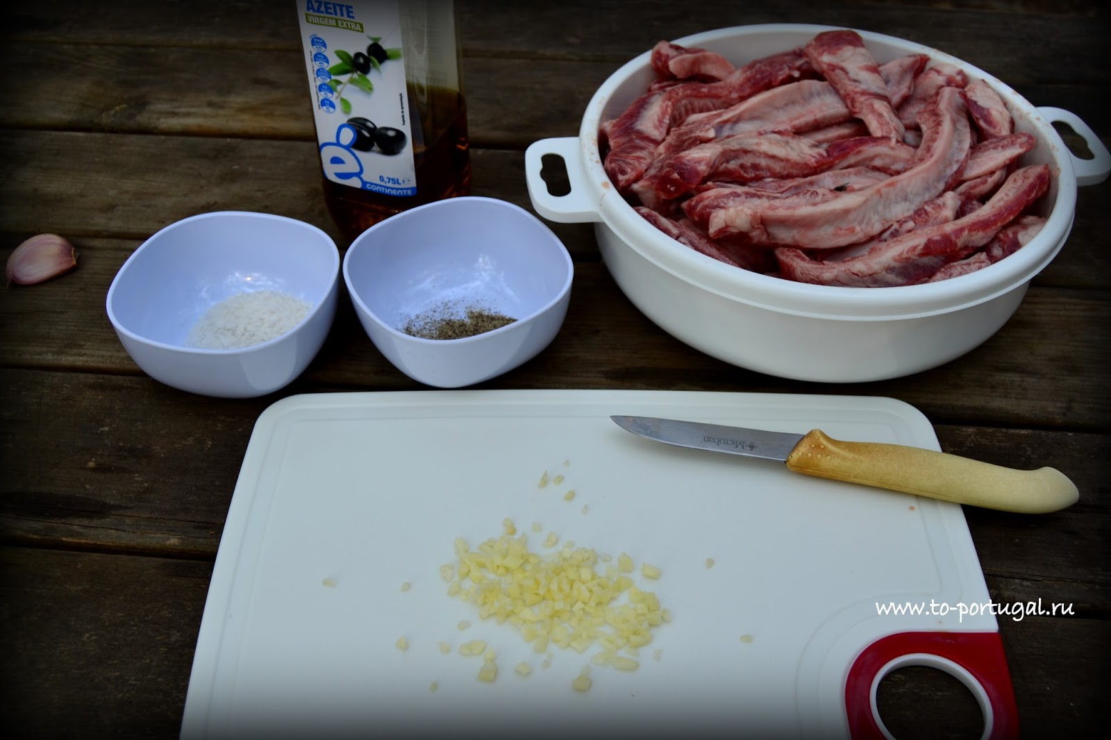 Оказывается, мясо черной свиньи не требует никакой особой подготовки. Его не нужно ни в чем мариновать. Единственное, что нам понадобится – это соль, немного перца, капелька оливкового масла и немного чеснока (хотя последнее необязательный ингредиент). Португальцы утверждают, что маринад только испортит неповторимый вкус мяса. Поэтому, послушаюсь специалистов и буду выполнять все по инструкции.
