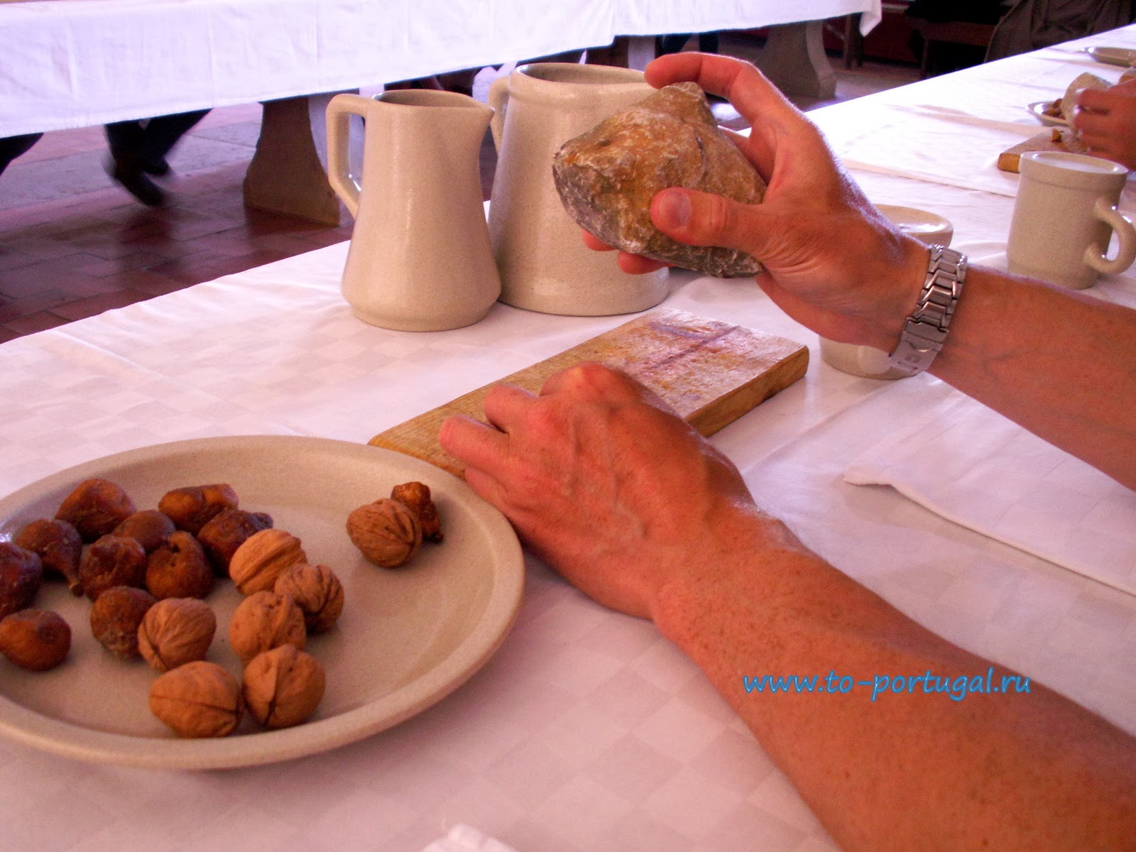 Мы быстро идем по каким-то залам и переходам старинного монастыря, боимся отстать от шустрого монаха-сыщика. В конце концов, перед нами трапезная, с накрытыми столами. Уже знакомые кувшины (красное, белое, вода) и первая трапеза – сушеный инжир, грецкие орехи, камень и доска для колки. Все едят и пьют.