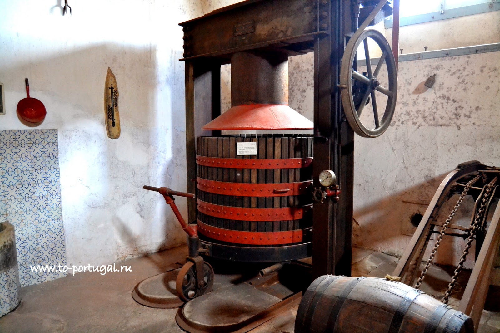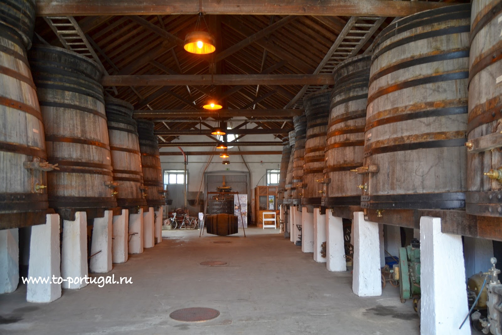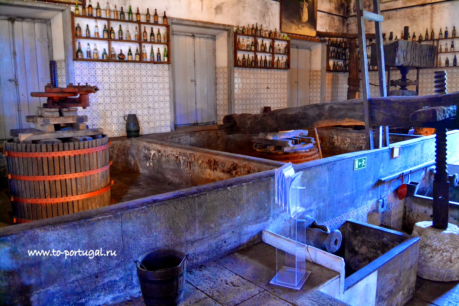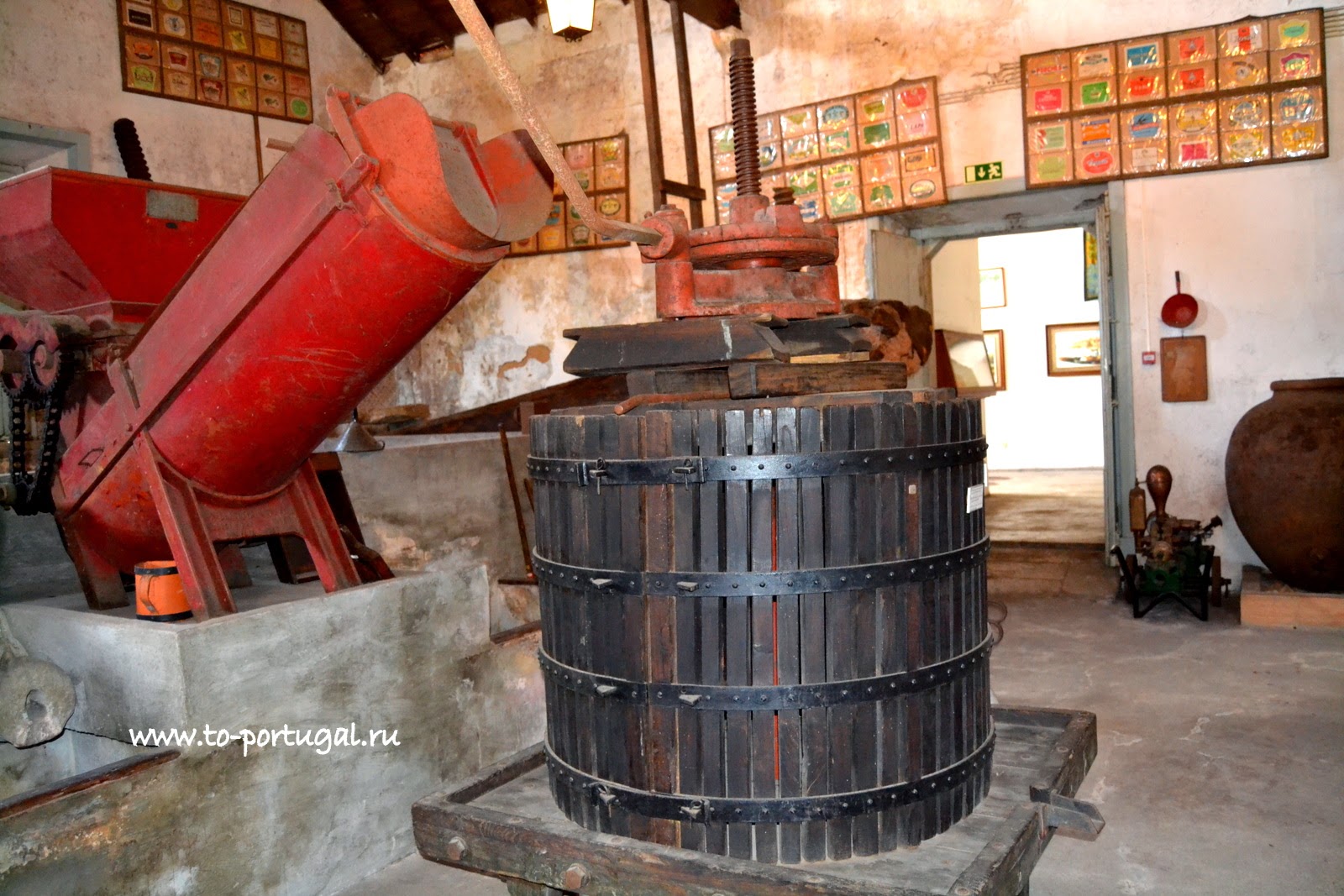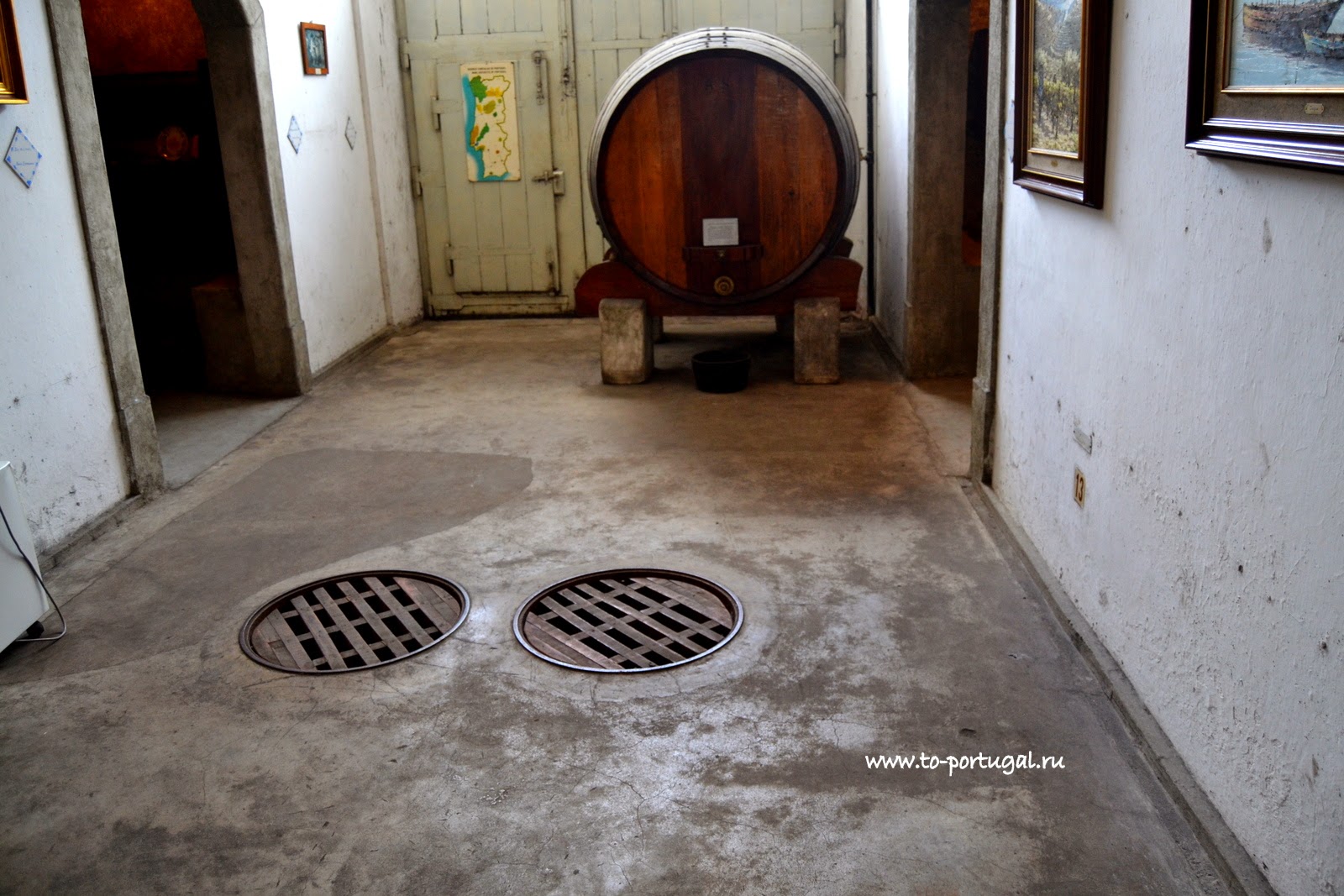 Здесь, в Музее вина, в португальском городе Алкобаса, мы побывали в нескольких залах. Экскурсия началась с погреба, где виноград превращался в красное вино. В больших бочках, выжатый и очищенный виноград, проходил ферментацию.